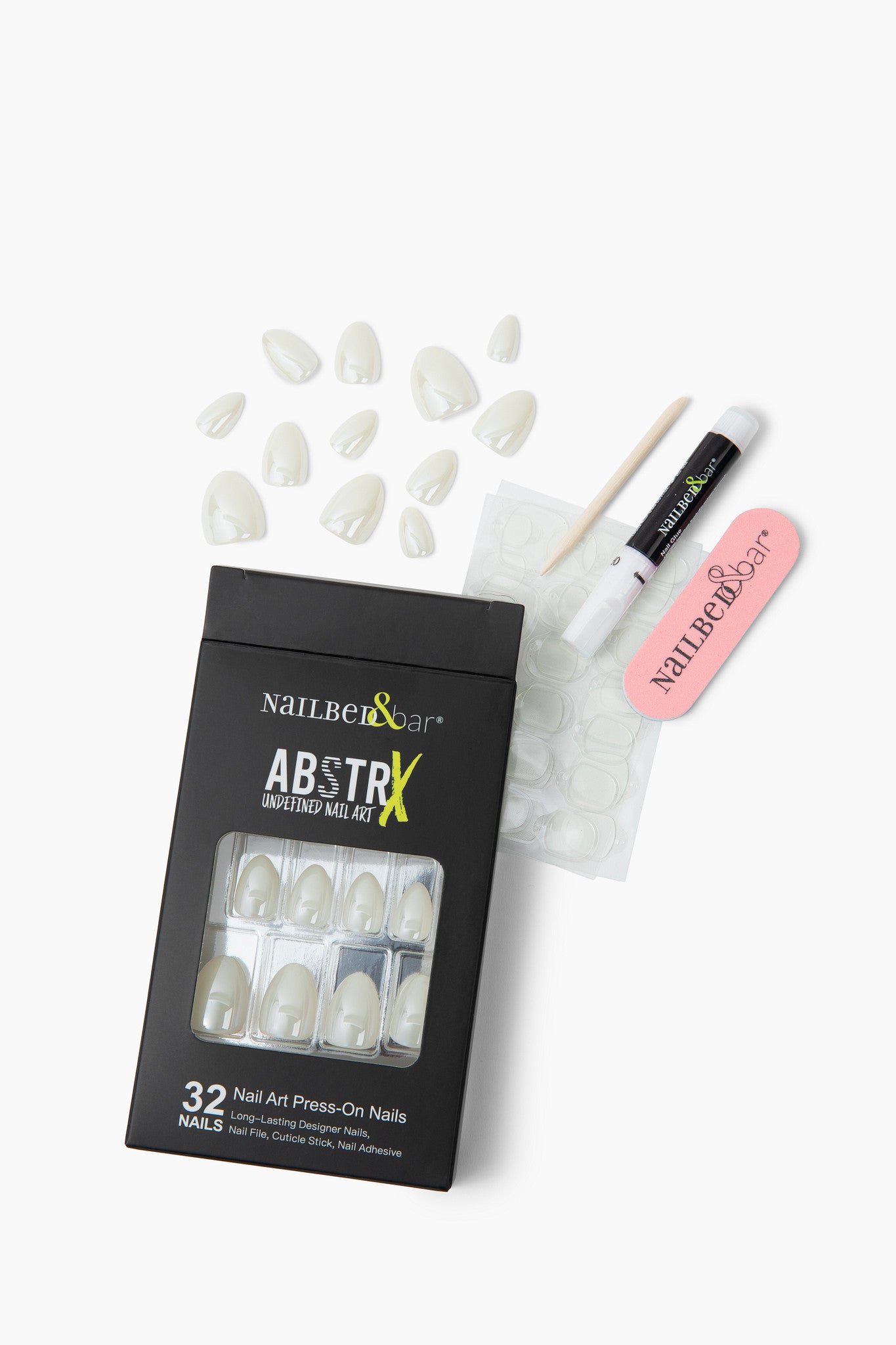 The ABSTRX way: Collection includes: 32 Nails/15 Inclusive Sizes/Nail Adhesive/ Nailbed & Bar Signature Nail File/Cuticle Stick (Press-on Pro Tip: Each nail is labeled with a size from 0-15, making it quick and easy to select the perfect size for each nail- no more guessing games)